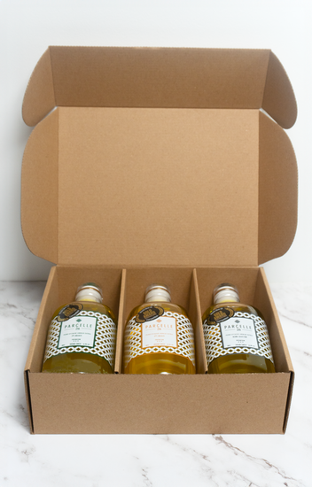 Retrouvez dans la gamme parfaite nos trois bouteilles iconiques de 50cl dans leur coffret kraft Parcelle 26.